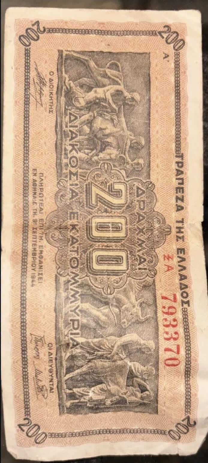 2 Banknotes Kingdom of Greece 100 Drachmai 1953 Emperor Constantine and 200 Drachmas 1944 Serial 793370