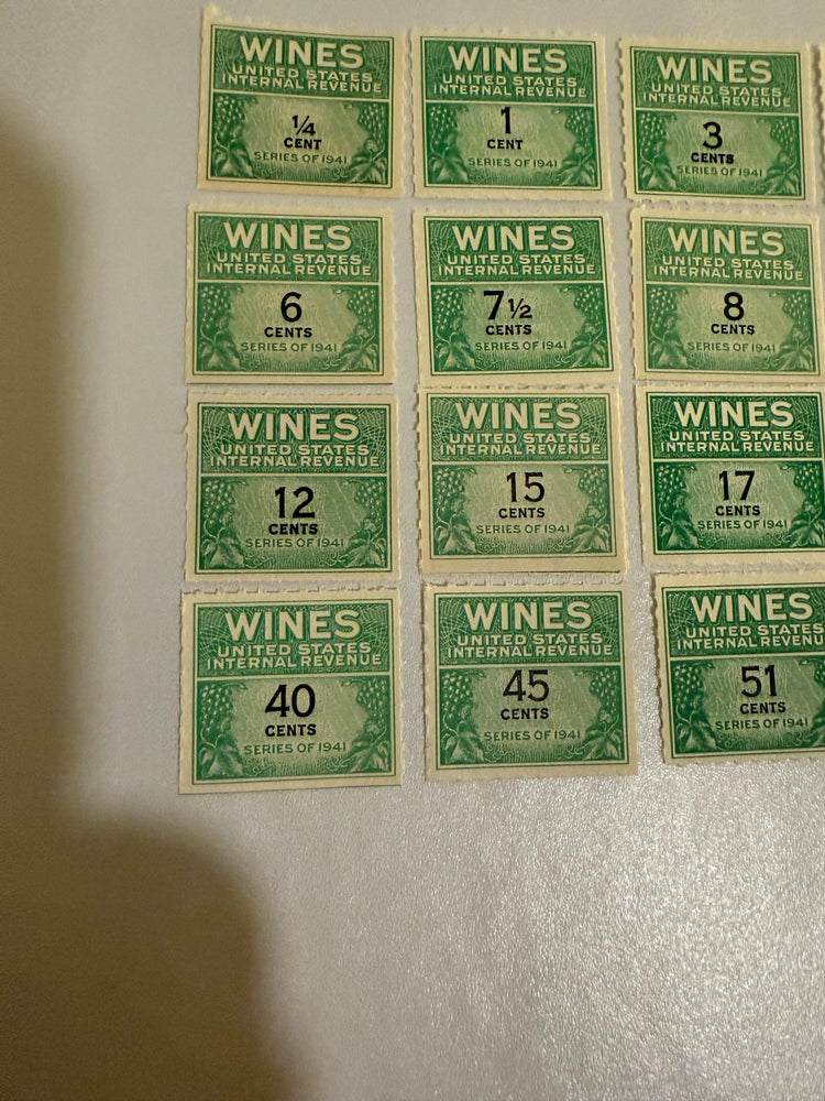 US Revenue Wine Stamps MNH #'s 109, 111, 113, 117, 118, 120, 121, 122, 123, 125, 127, 130, 133, 135, 136, 137, 141, 146, 183, 186, 191, 192